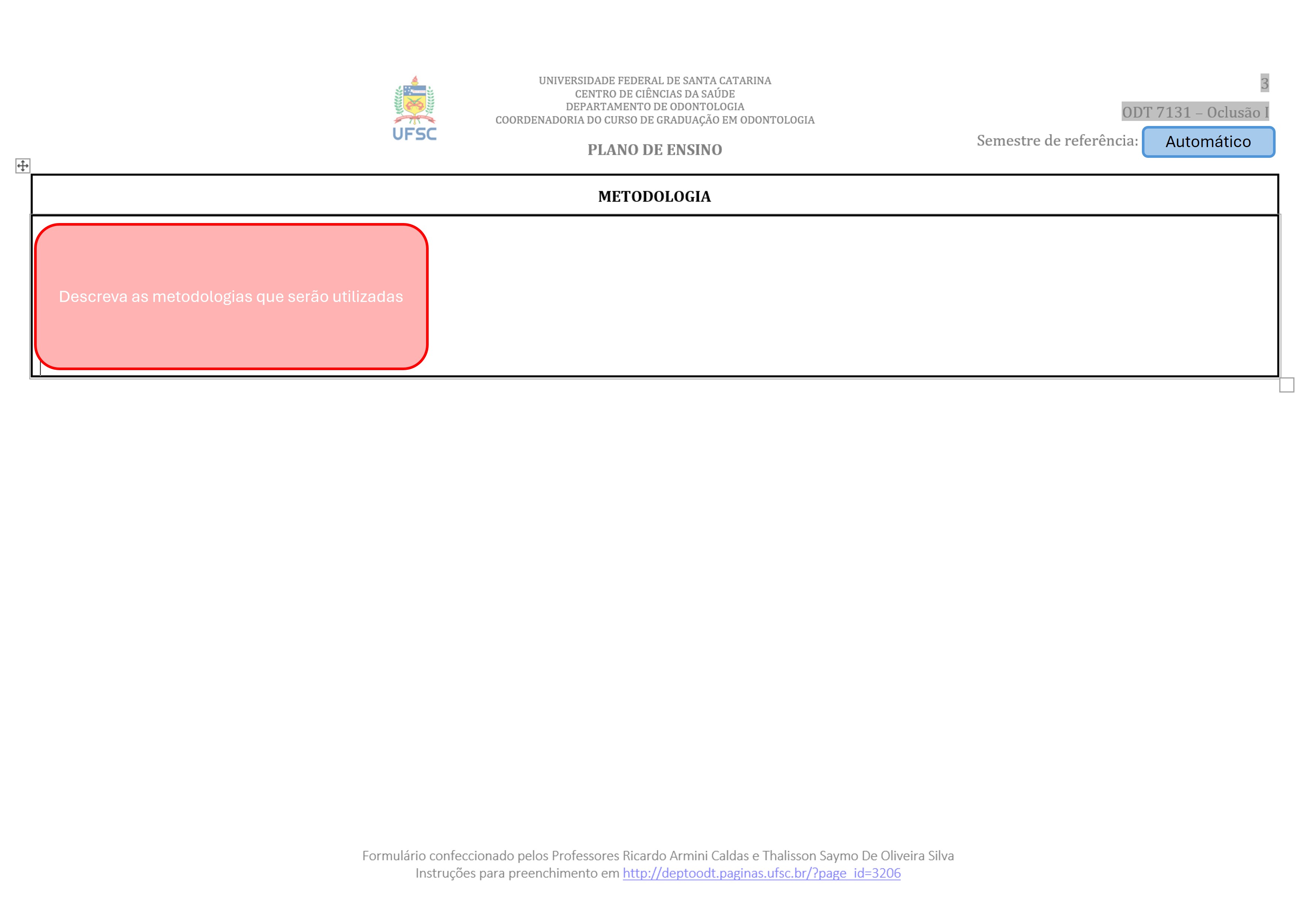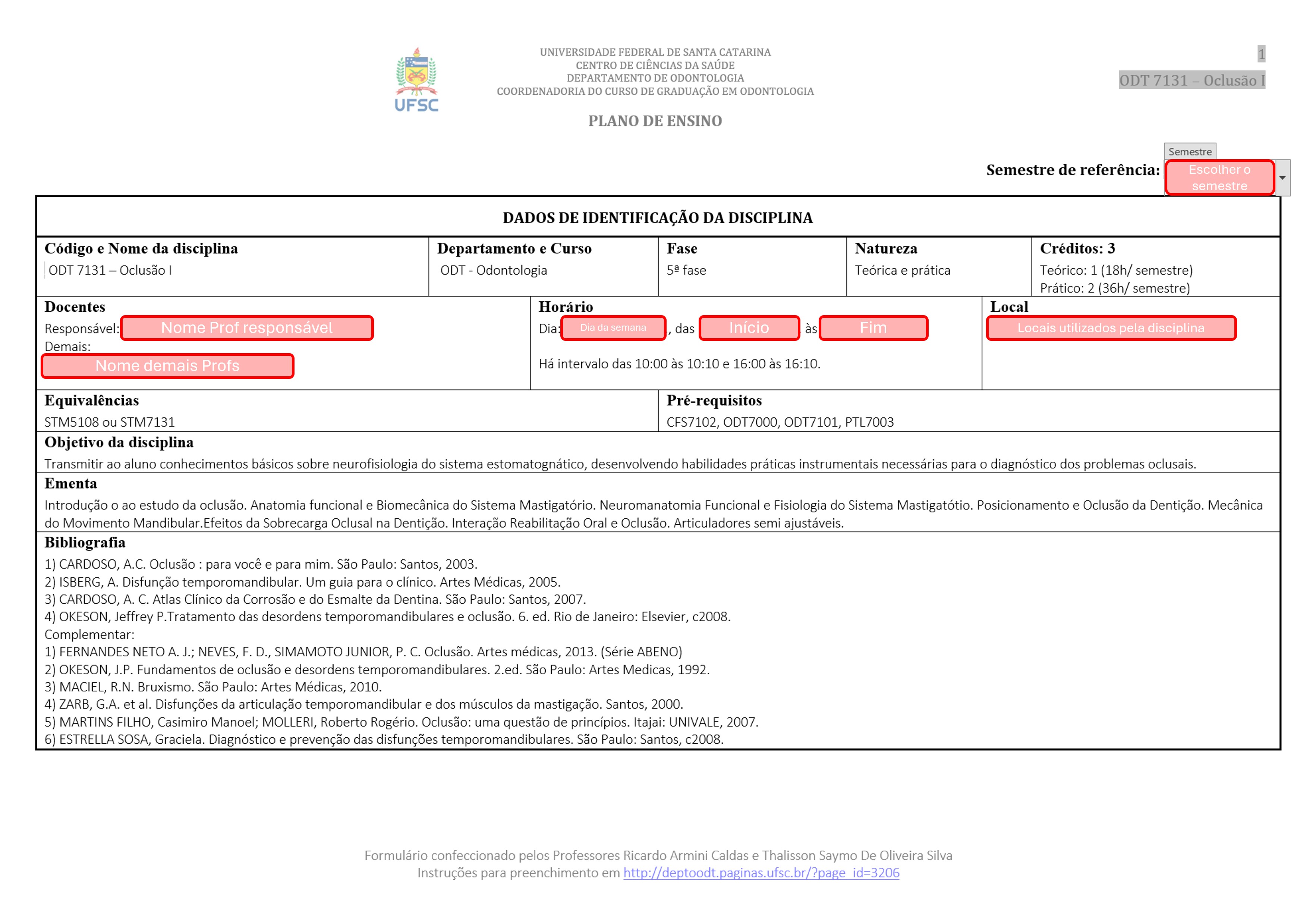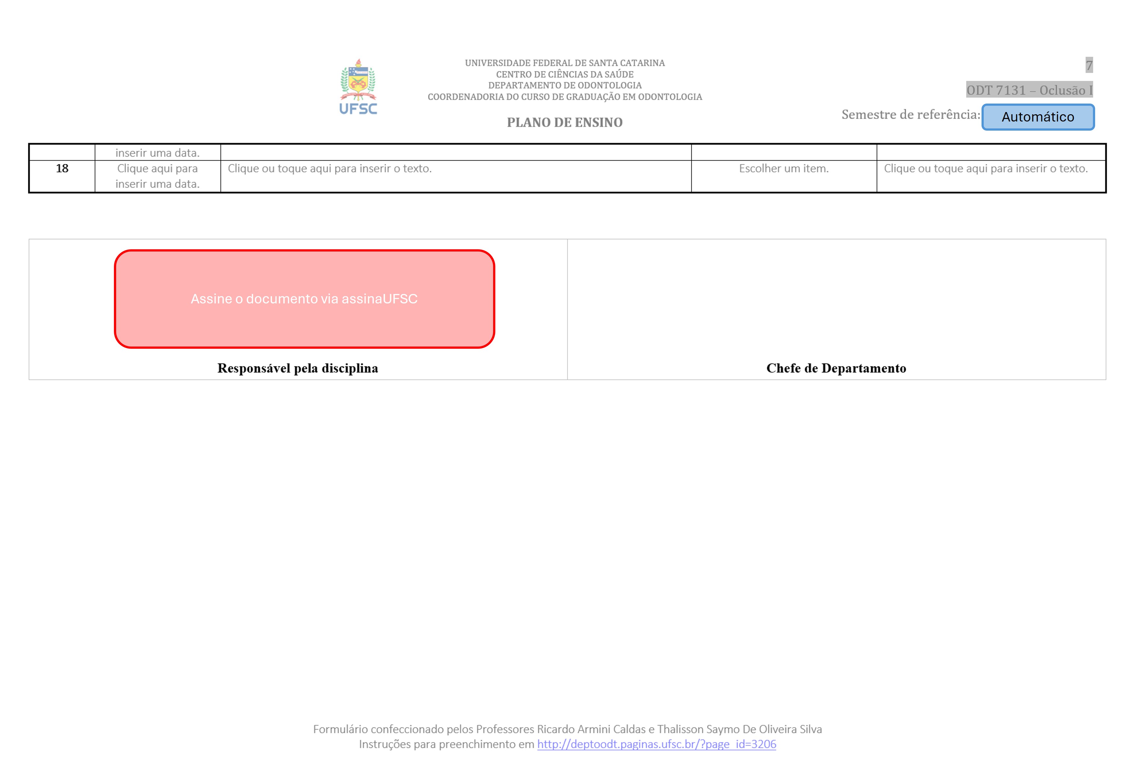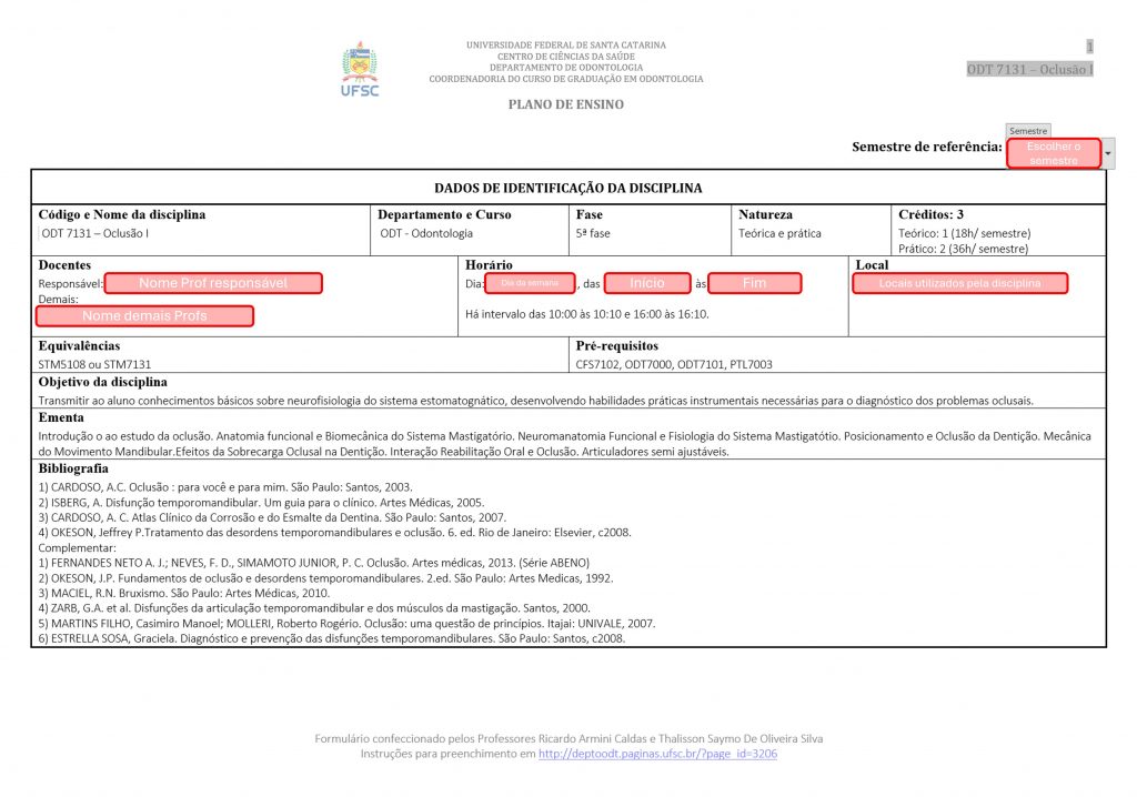 O documento modelo pode ser baixado no link Modelos de Plano de Ensino ODT – Currículo 2007 – Atual, que deve ser preenchido e enviado por email para o Departamento pelo link de compartilhamento do assina.ufsc já assinado.