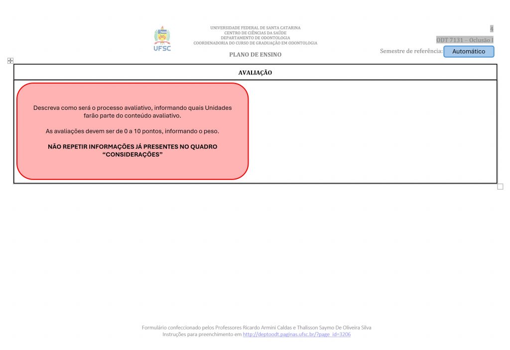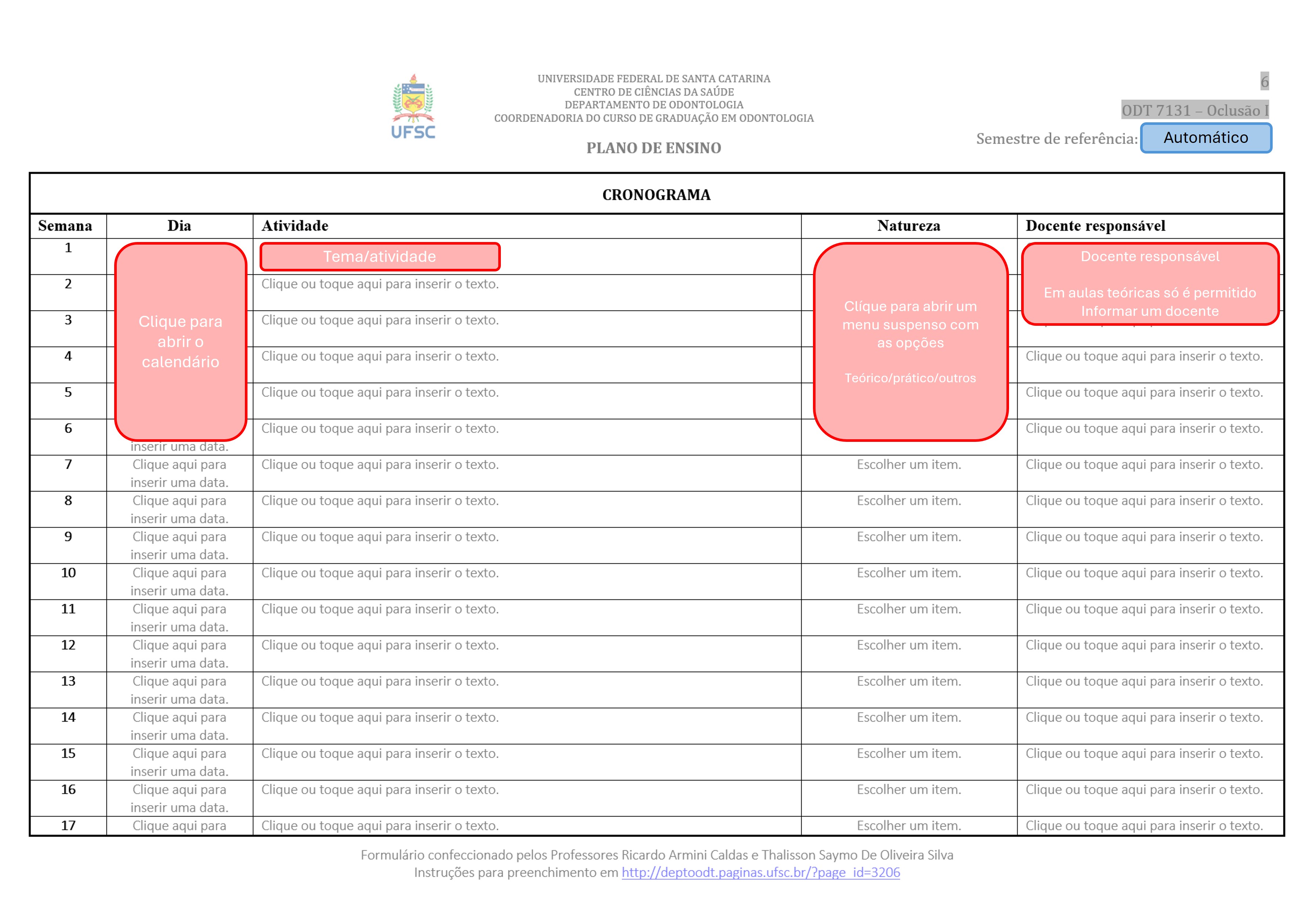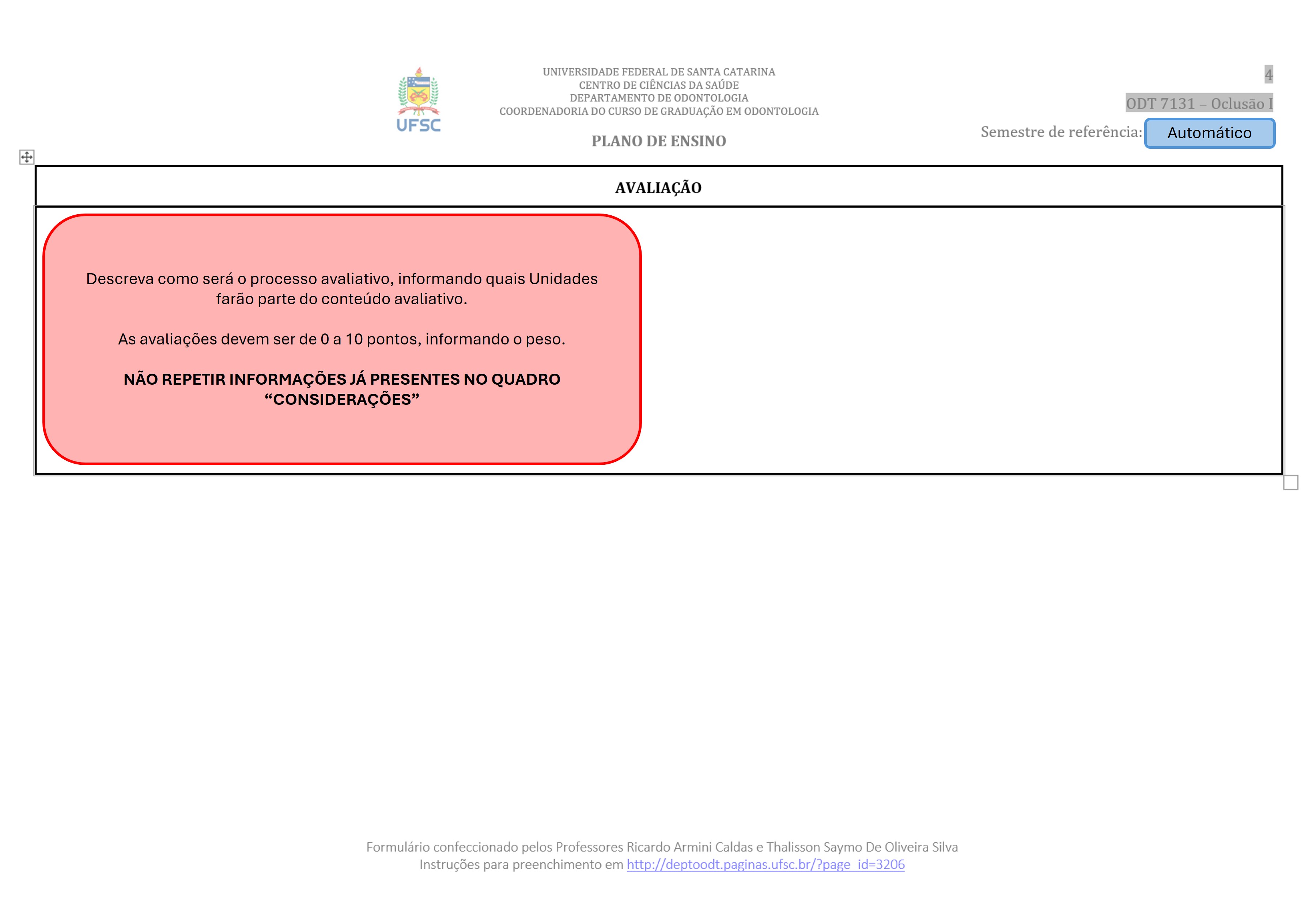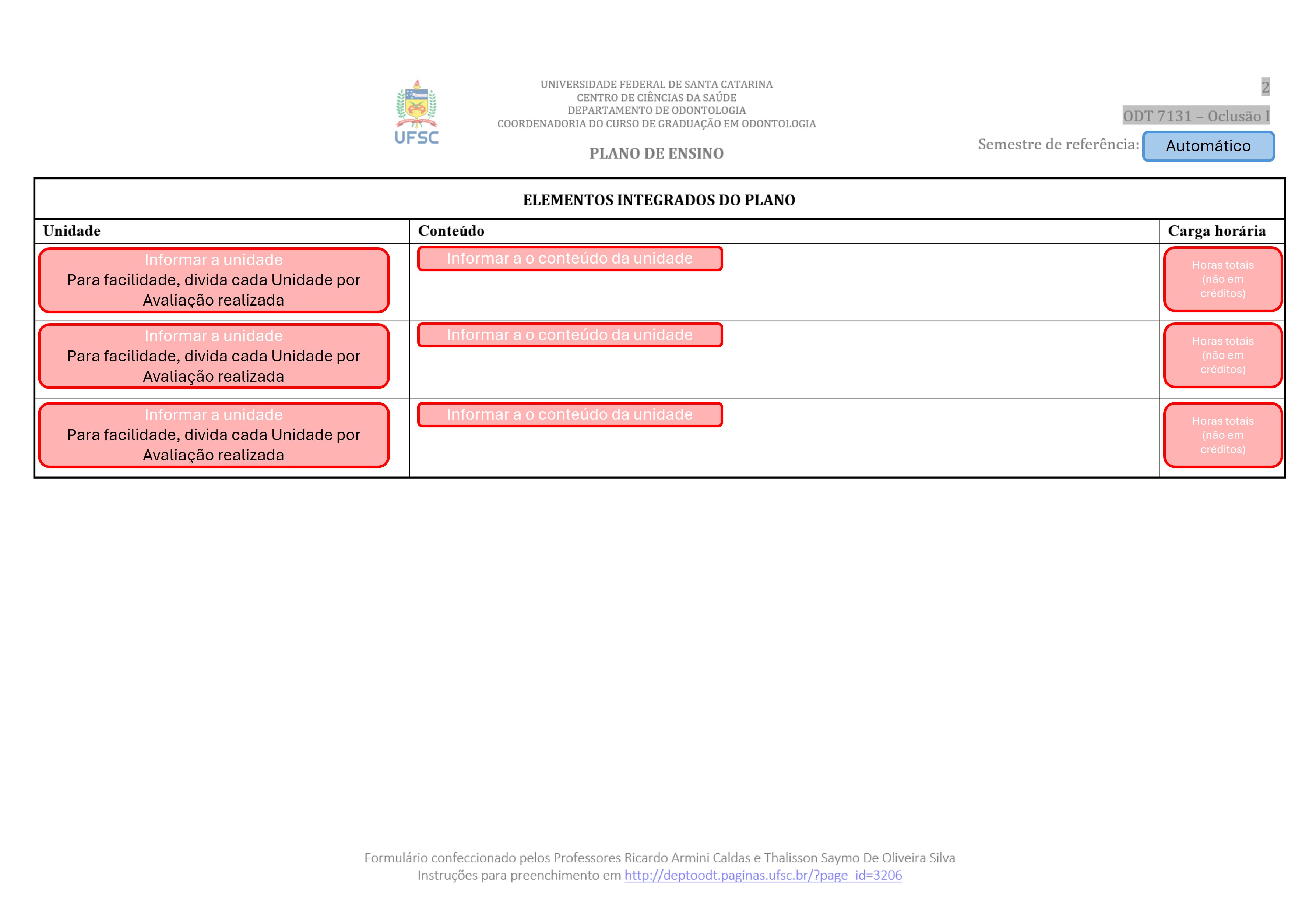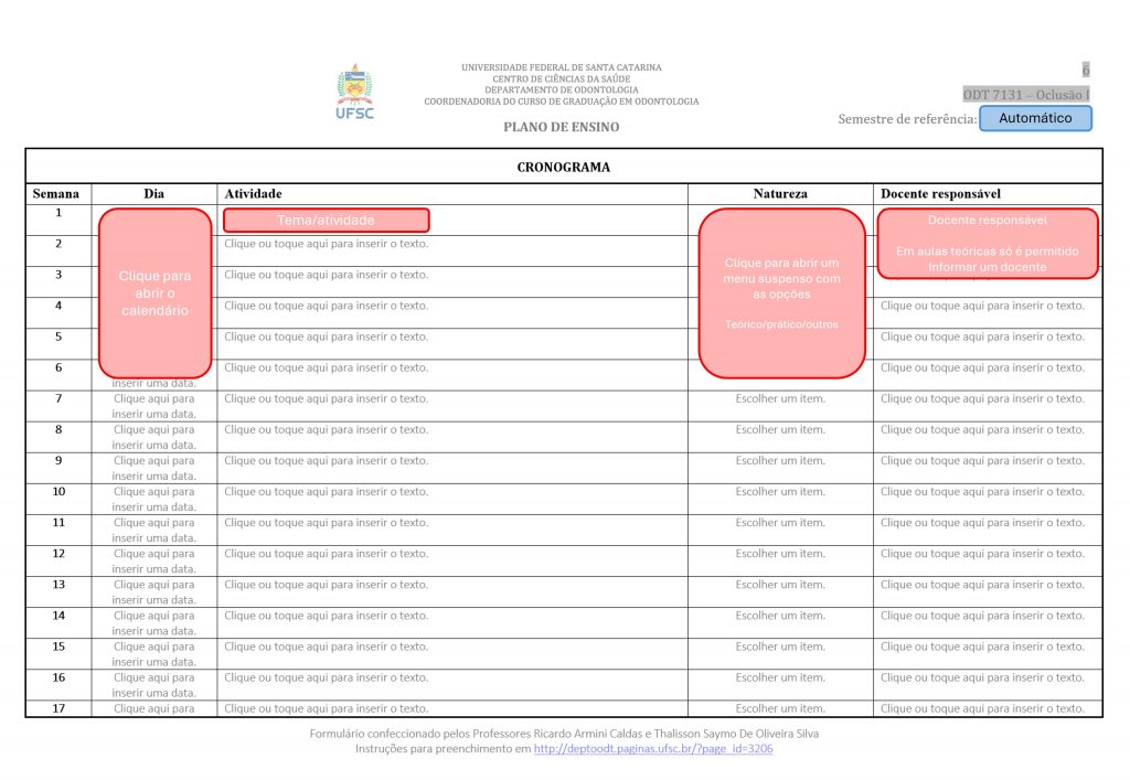 O documento modelo pode ser baixado no link Modelos de Plano de Ensino ODT – Currículo 2007 – Atual, que deve ser preenchido e enviado por email para o Departamento pelo link de compartilhamento do assina.ufsc já assinado.