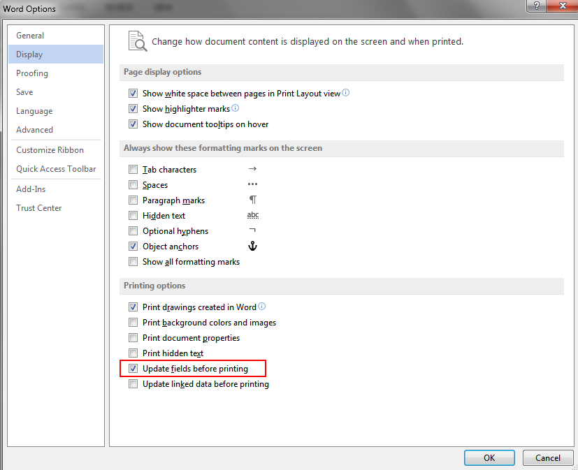 Clique em FILE > Opções > Exibir e, em Opções de Impressão, selecione a caixa de seleção Para campos Update antes de imprimir como na Imagem abaixo. Isso assegurará que os campos de Semestre de Referência das páginas seguintes serão preenchidos automaticamente ao salvar em PDF.